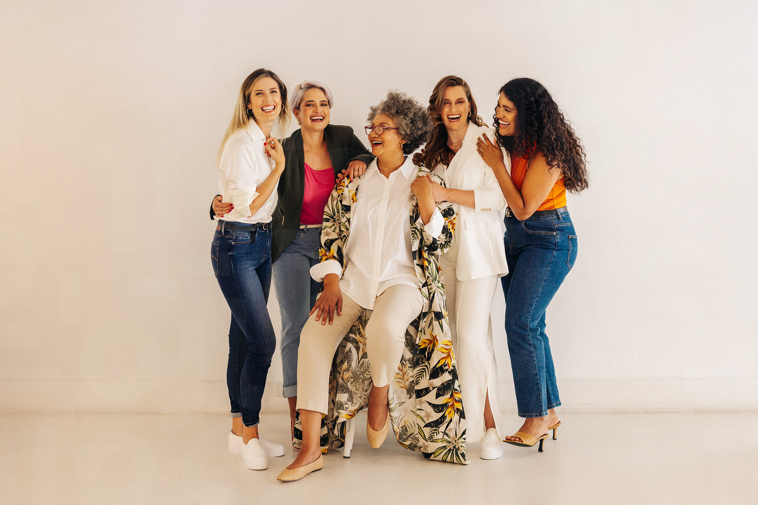 Successful female entrepreneurs laughing happily while standing together in an office. Group of multicultural businesswomen working as a team in an all-female startup.