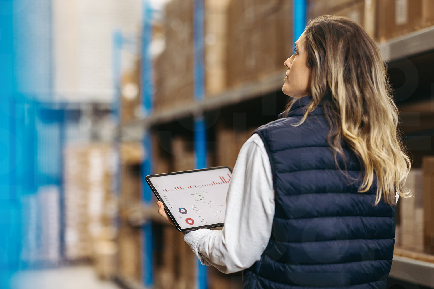 Rearview of a warehouse manager using warehouse management software on a digital tablet. Female logistics employee working with statistical reports on her inventory management dashboard.