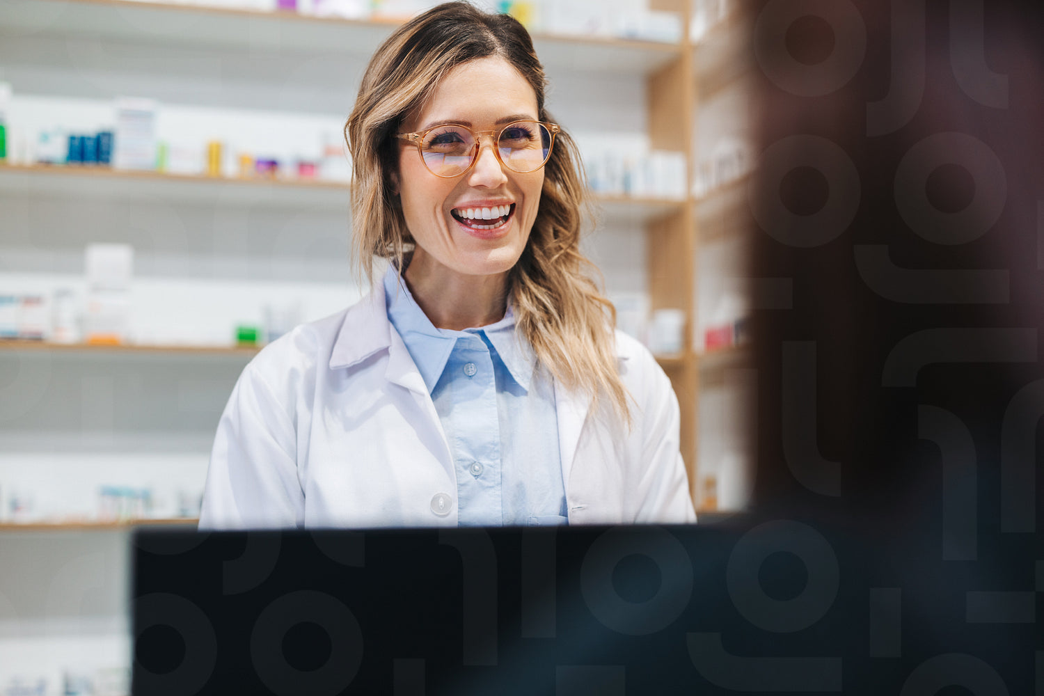 Woman assisting a patient over the counter in a pharmacy. Female healthcare provider dispensing medication in a drug store.