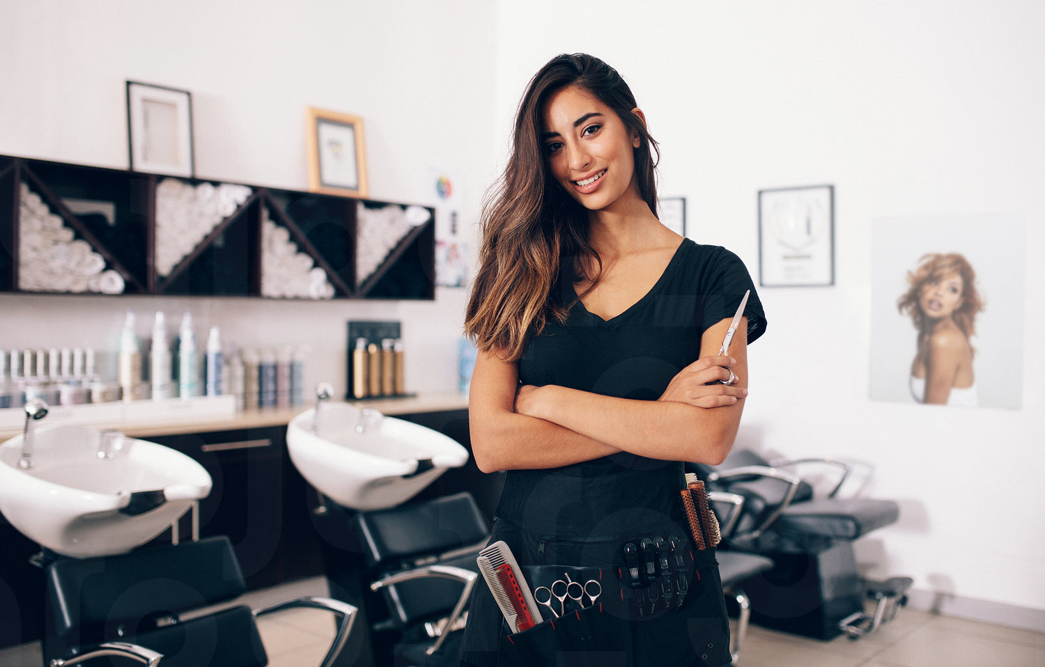 Female hairdresser in salon holding scissors in hand. Smiling young hairdresser standing in salon.