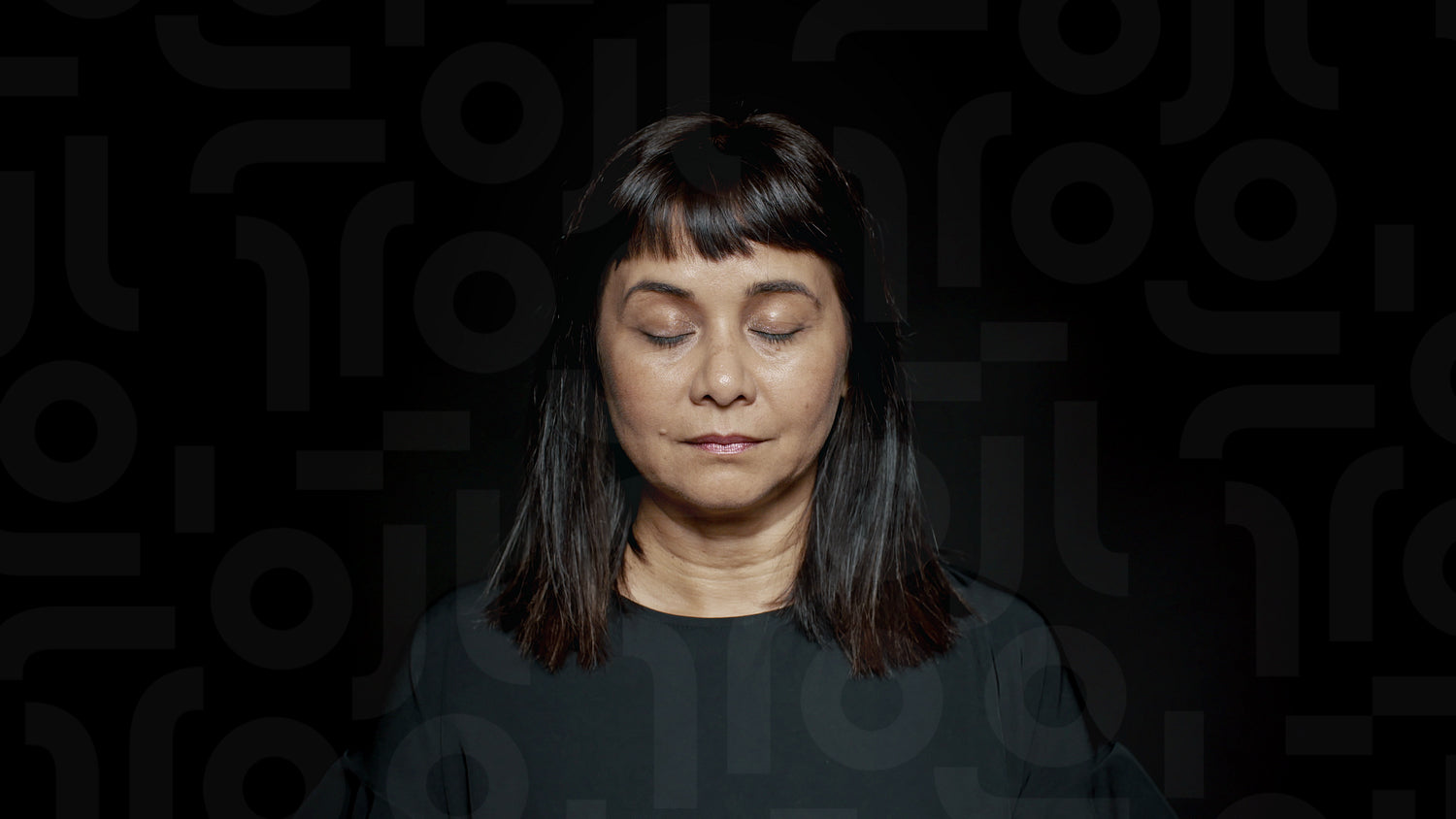 Close up of middle aged woman with her eyes closed. Woman in with short hair thinking on black background.