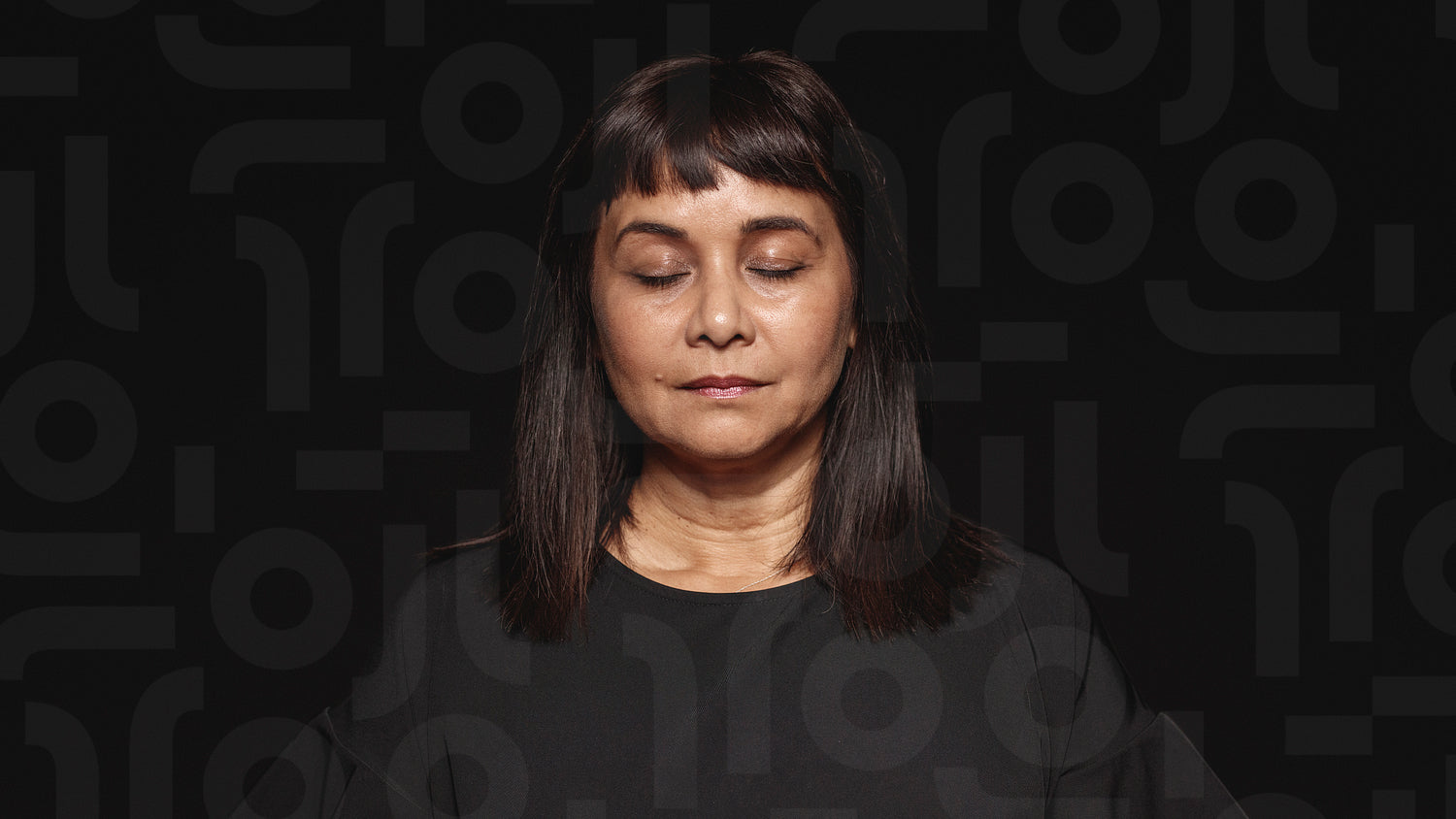 Close up of middle aged woman with her eyes closed. Woman in black dress isolated on black background.