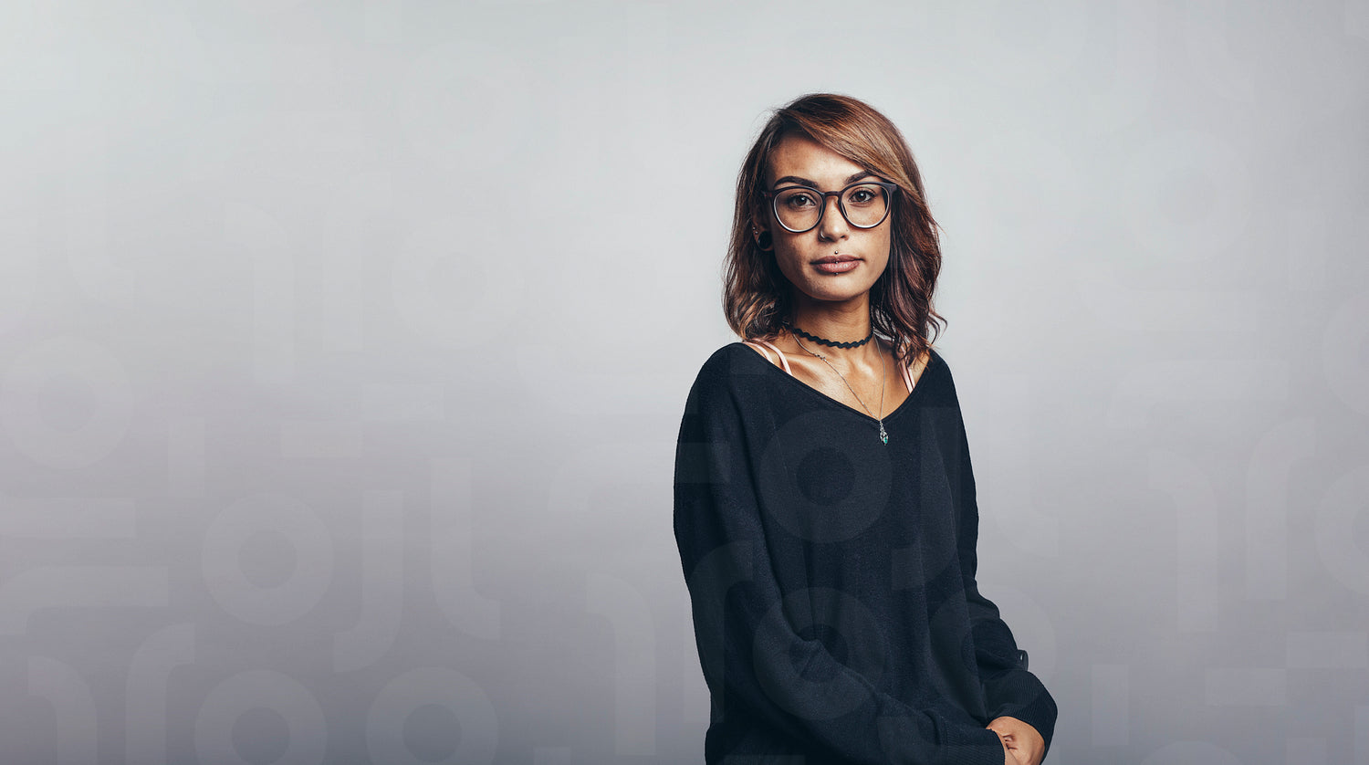 Woman in eyeglasses isolated on grey background. Portrait of woman standing with arms crossed looking at camera.