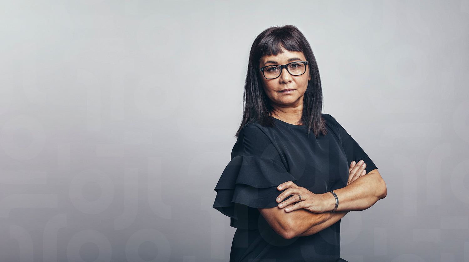 Woman standing against grey background looking at camera. Middle aged woman standing with her arms crossed.