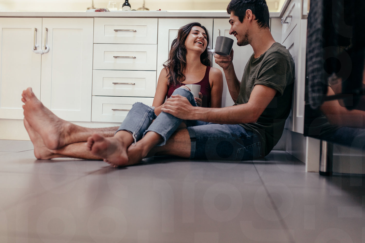 Happy young couple relaxing in kitchen having coffee. Young man and woman sitting on kitchen floor drinking coffee