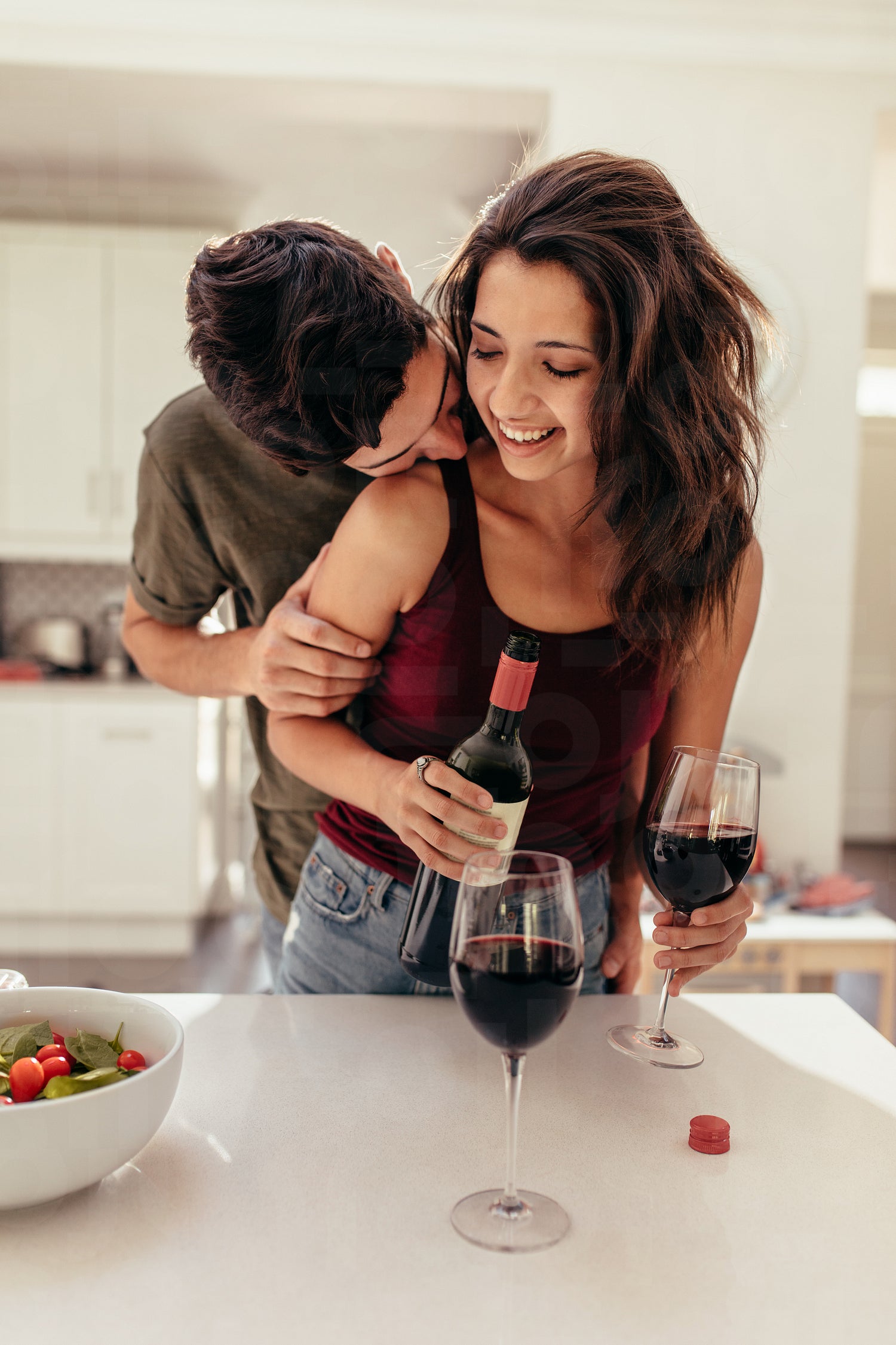 Couple having date night. Man standing behind a woman filling wine glasses in kitchen. Romantic couple in the kitchen with wine.