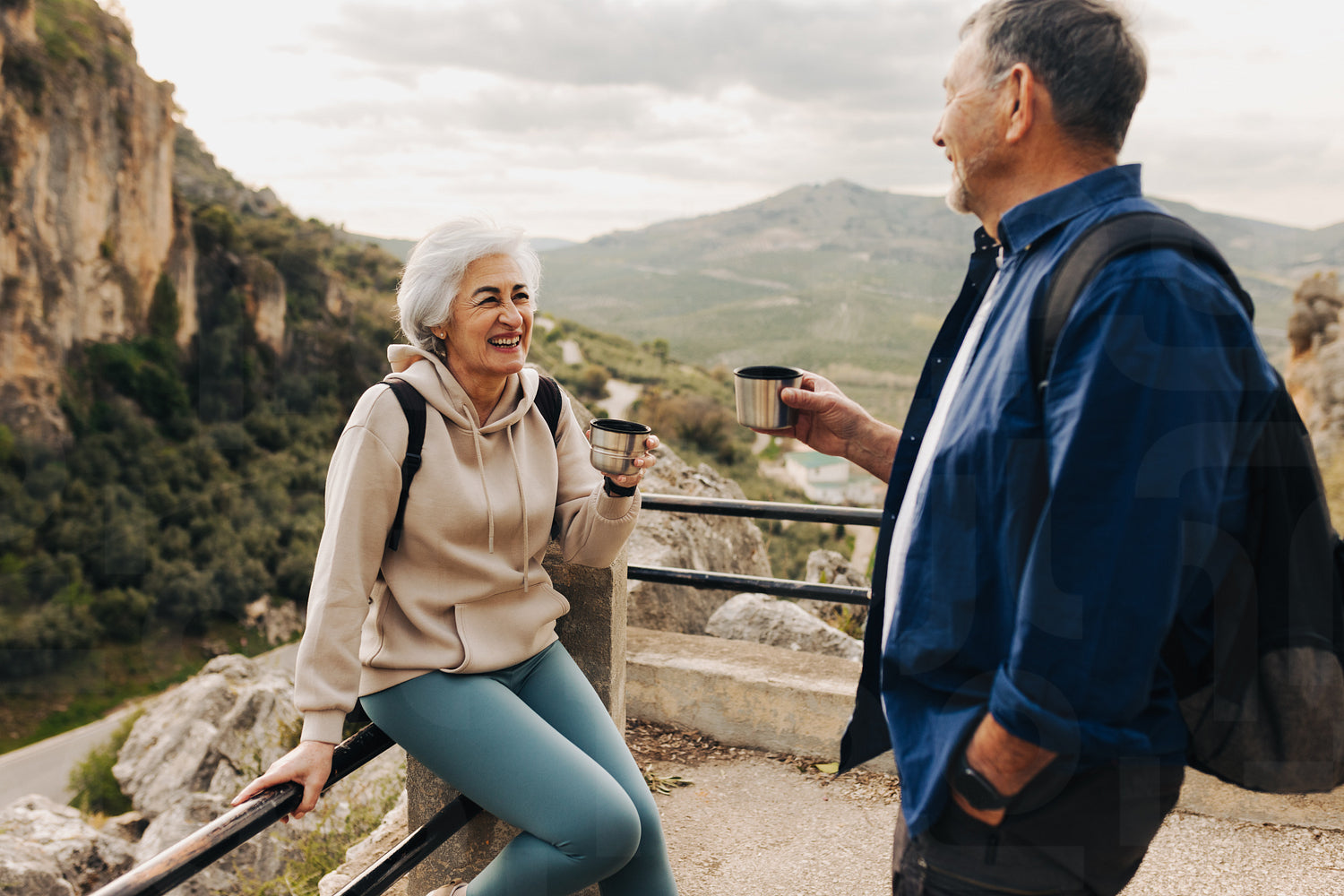 Cheerful senior couple having a chat while taking a coffee break on a hilltop. Elderly couple enjoying a leisurely hike outdoors. Adventurous couple spending quality time together after retirement.