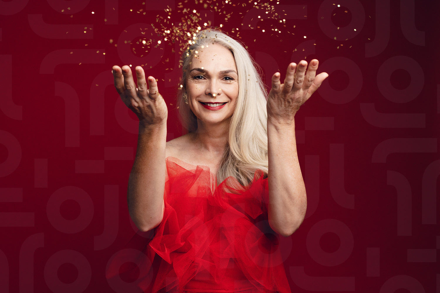 Senior woman throwing star shaped golden confetti in air. Mature woman having fun with glitters against red background.