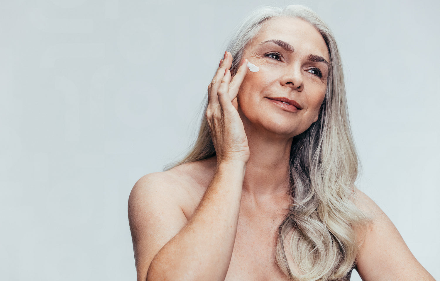 Senior woman putting on anti aging cream on her face and looking away. Female applying moisturizer lotion on her face against grey background.
