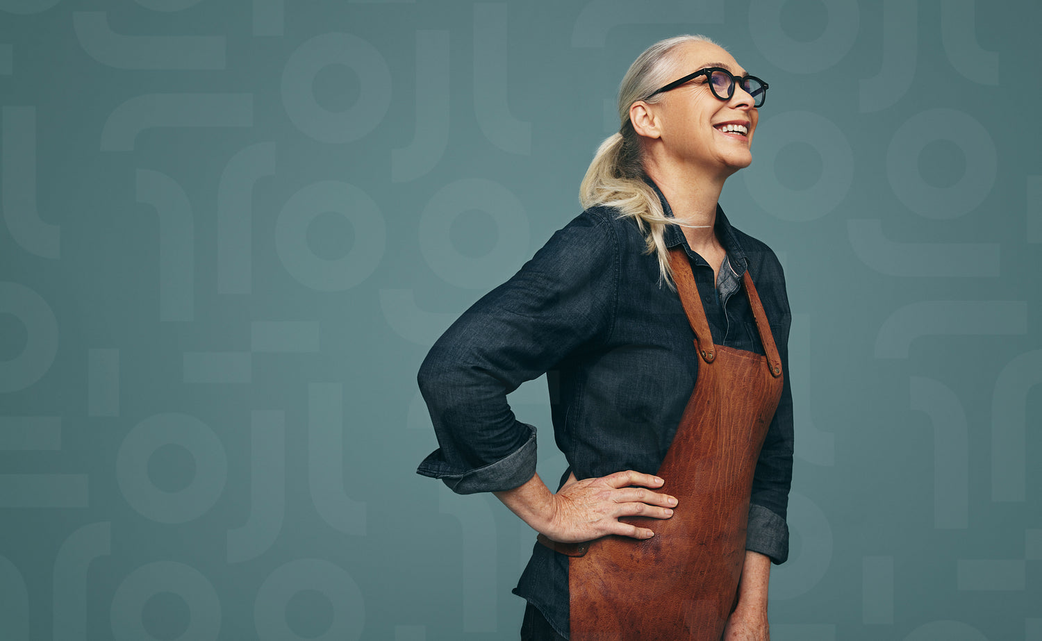 Cheerful female goldsmith laughing happily while standing against a studio background. Mature jewellery maker wearing a brown leather apron in a studio.