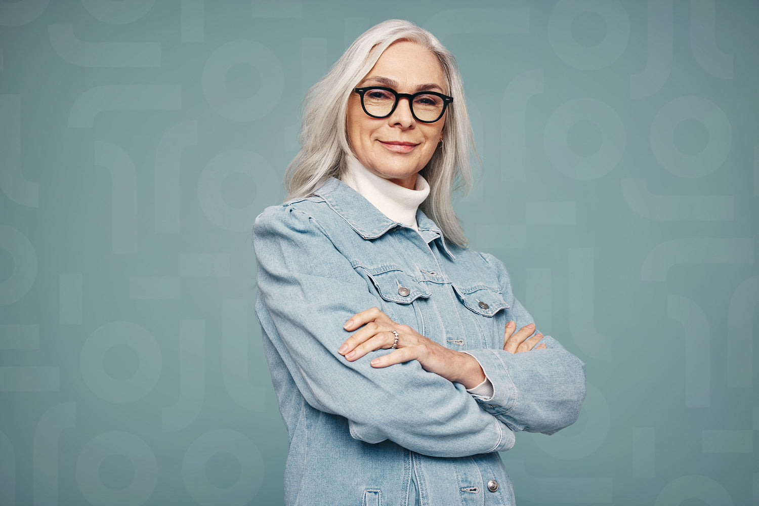 Empowered mature woman looking at the camera confidently. Grey-haired woman standing with her arms crossed against a studio background. Strong independent woman embracing girl power.