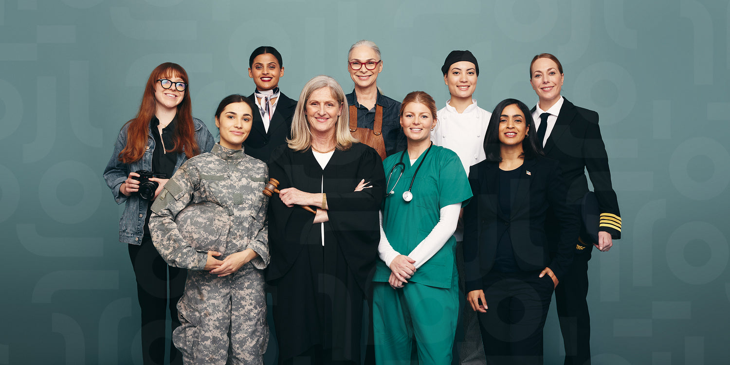 Multicultural women from different professions standing together in their occupational attires. Empowered female professionals smiling at the camera while standing against a studio background.