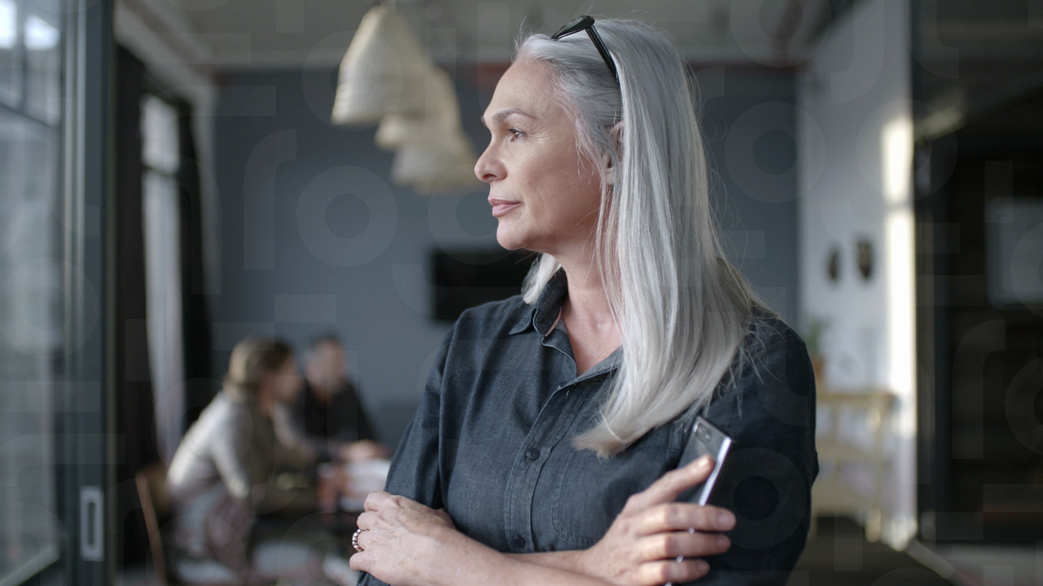Smiling senior woman standing outside meeting room with team discussing work in background. Mature businesswoman at standing office and looking around.