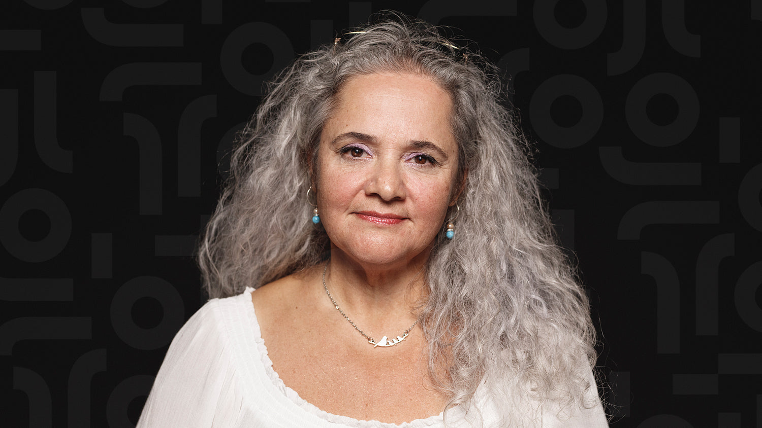 Old woman in white hair isolated on black background. Close up of senior woman looking at camera.