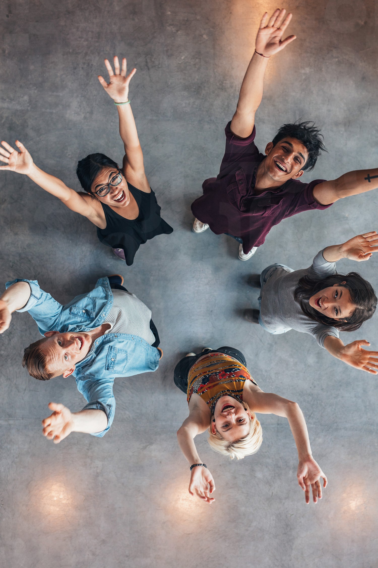Overhead view of young people standing together looking up at camera with their arms raised. University students cheering.