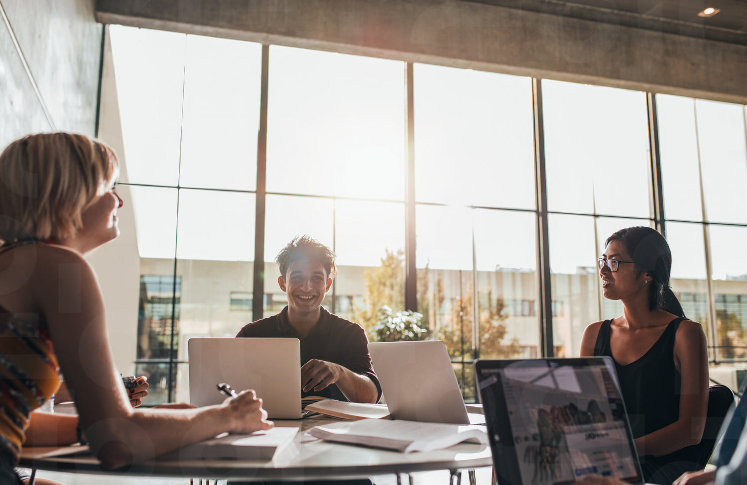 Young students sitting around a table in a library with books and laptop. University students doing group study in library.