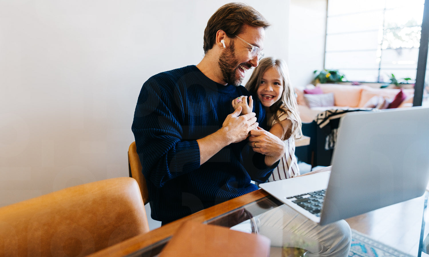 A father and daughter share a joyful moment at home, as they chat on a laptop with the girl hugging her dad, creating a warm, family-friendly scene.