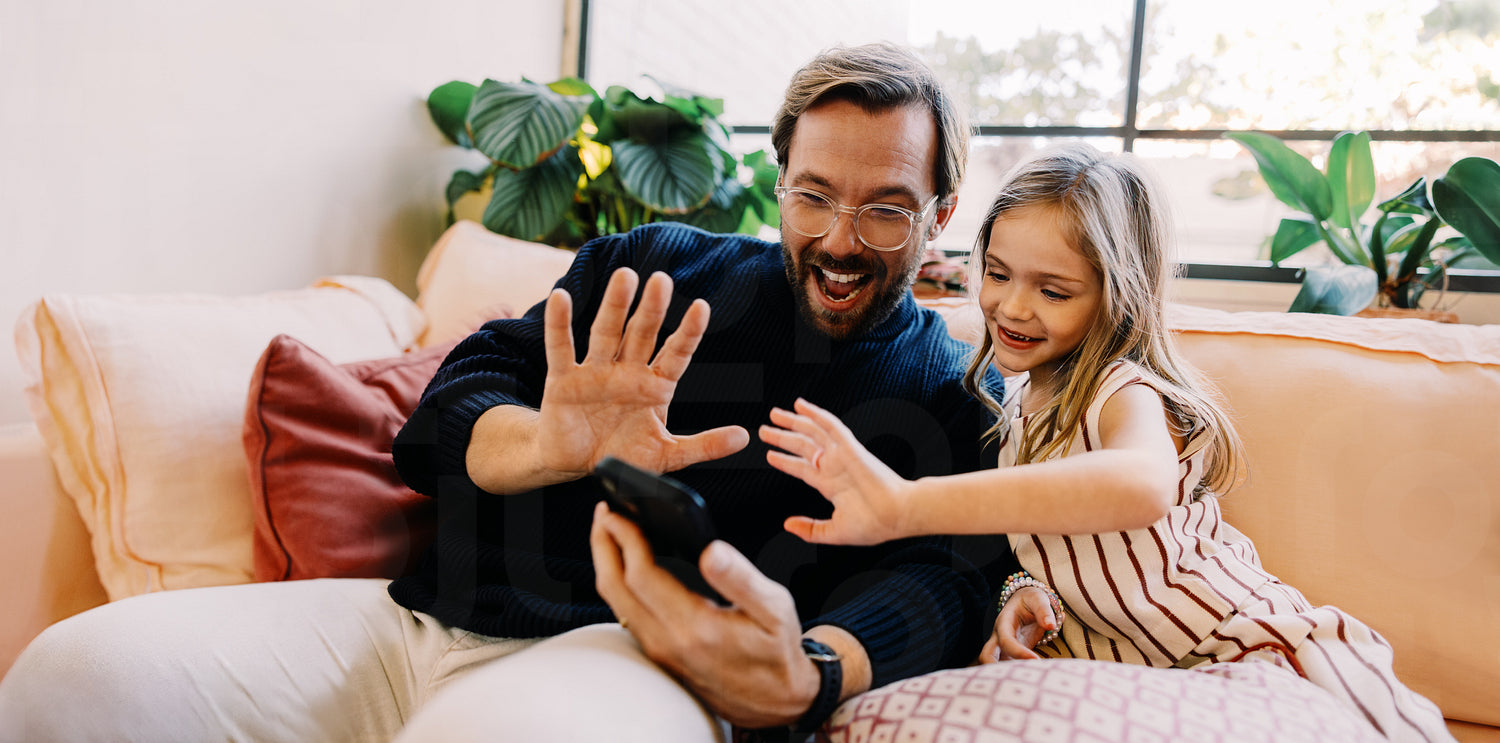 A man with glasses in a dark sweater sits on a pink sofa with a smiling girl in a striped dress, both waving at a phone held by the man.