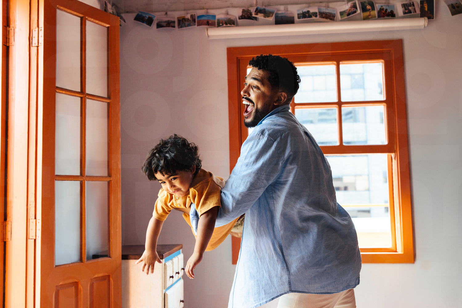 A Latin American father is joyfully lifting his child inside a sunlit and colorful home environment, playing the airplane game, showcasing love and happiness.