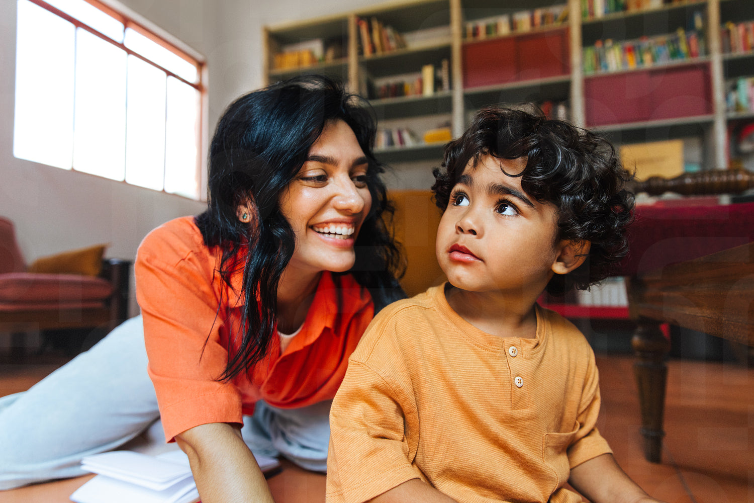 A joyful Latina woman interacts with her son, surrounded by bookshelves. The scene portrays warmth, happiness, and a nurturing bond between them, emphasizing a familial and educational context.
