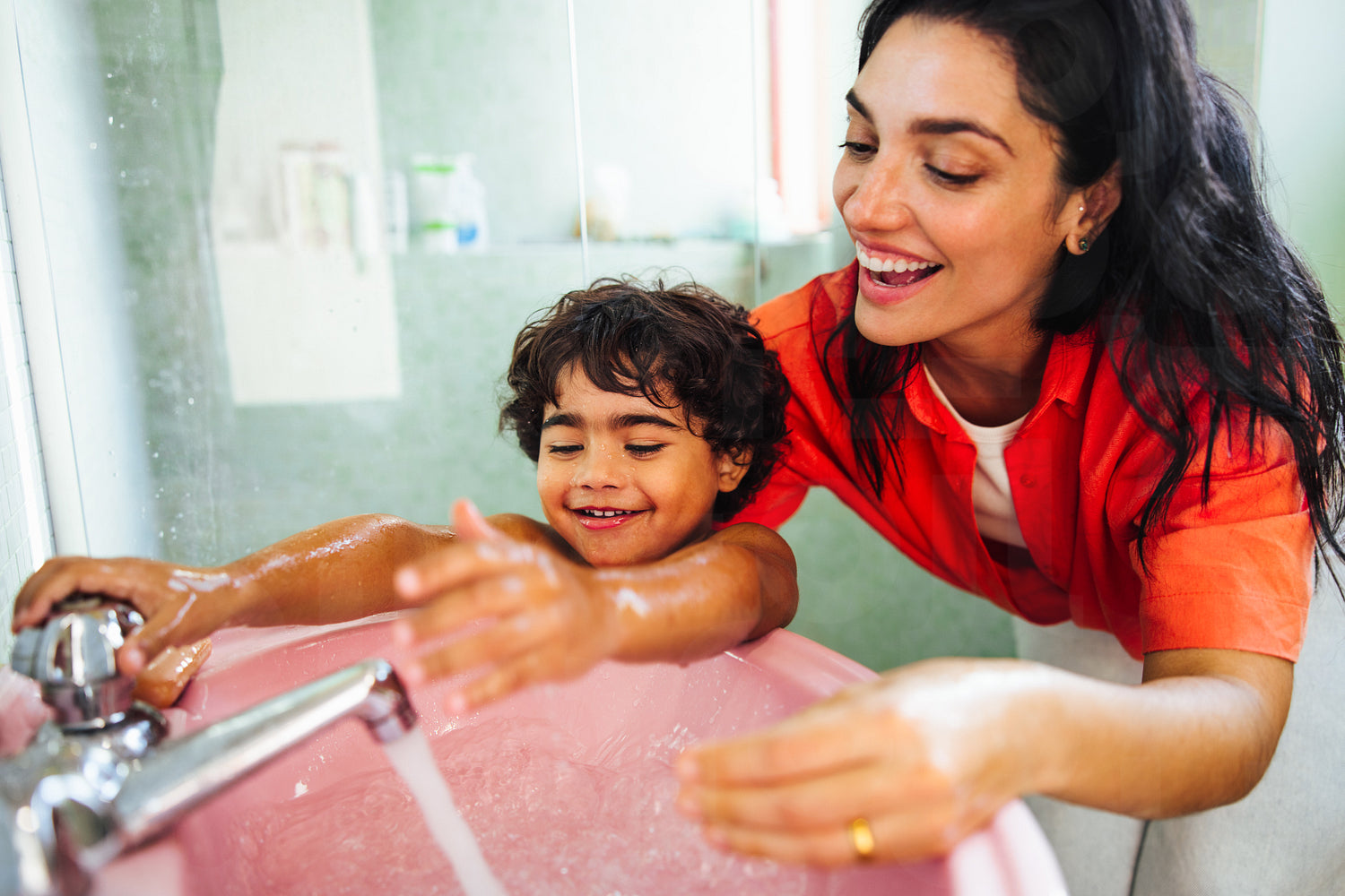 A mother guides her cheerful child in washing hands under running water in a bright and cozy bathroom, fostering the importance of hygiene and parent-child bonding through a joyful activity.