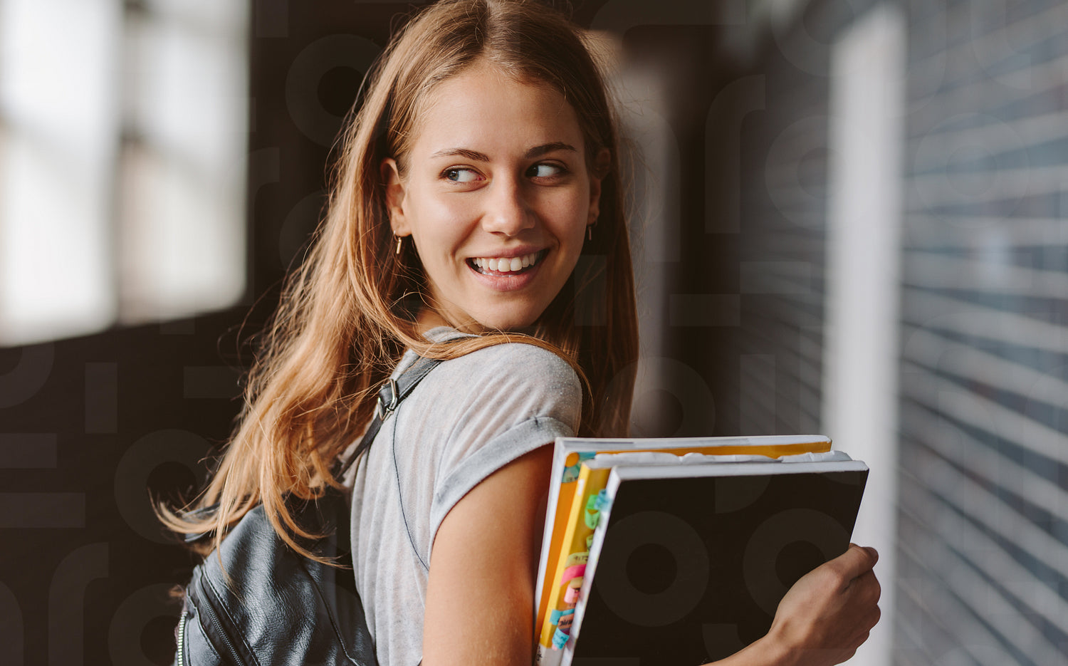 Rear view of beautiful female student walking through college hallway looking back and smiling. Girl going for the class.