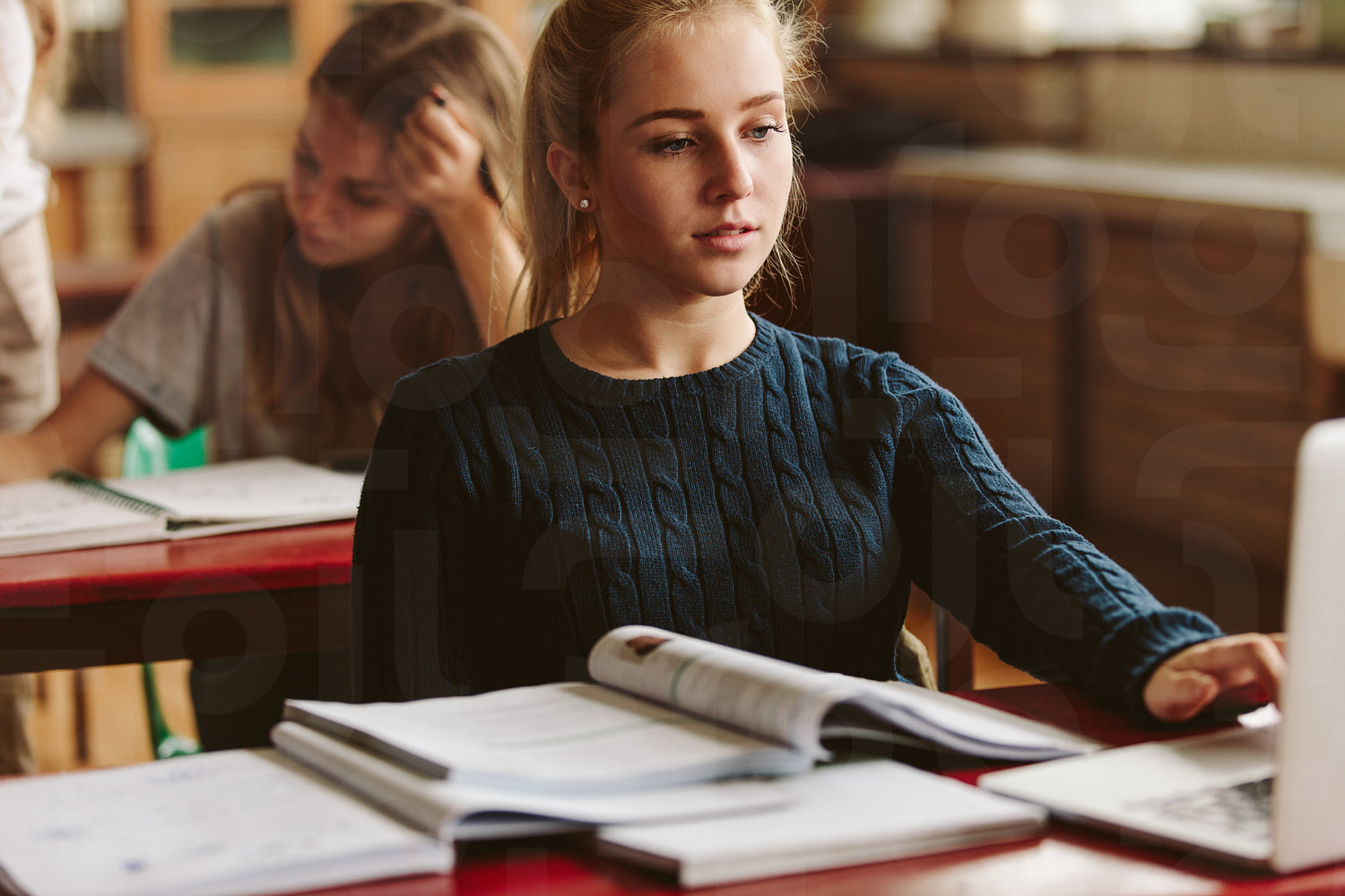 Portrait of beautiful teenage girl sitting in high school classroom with book using laptop. Female student using laptop for studies in classroom.