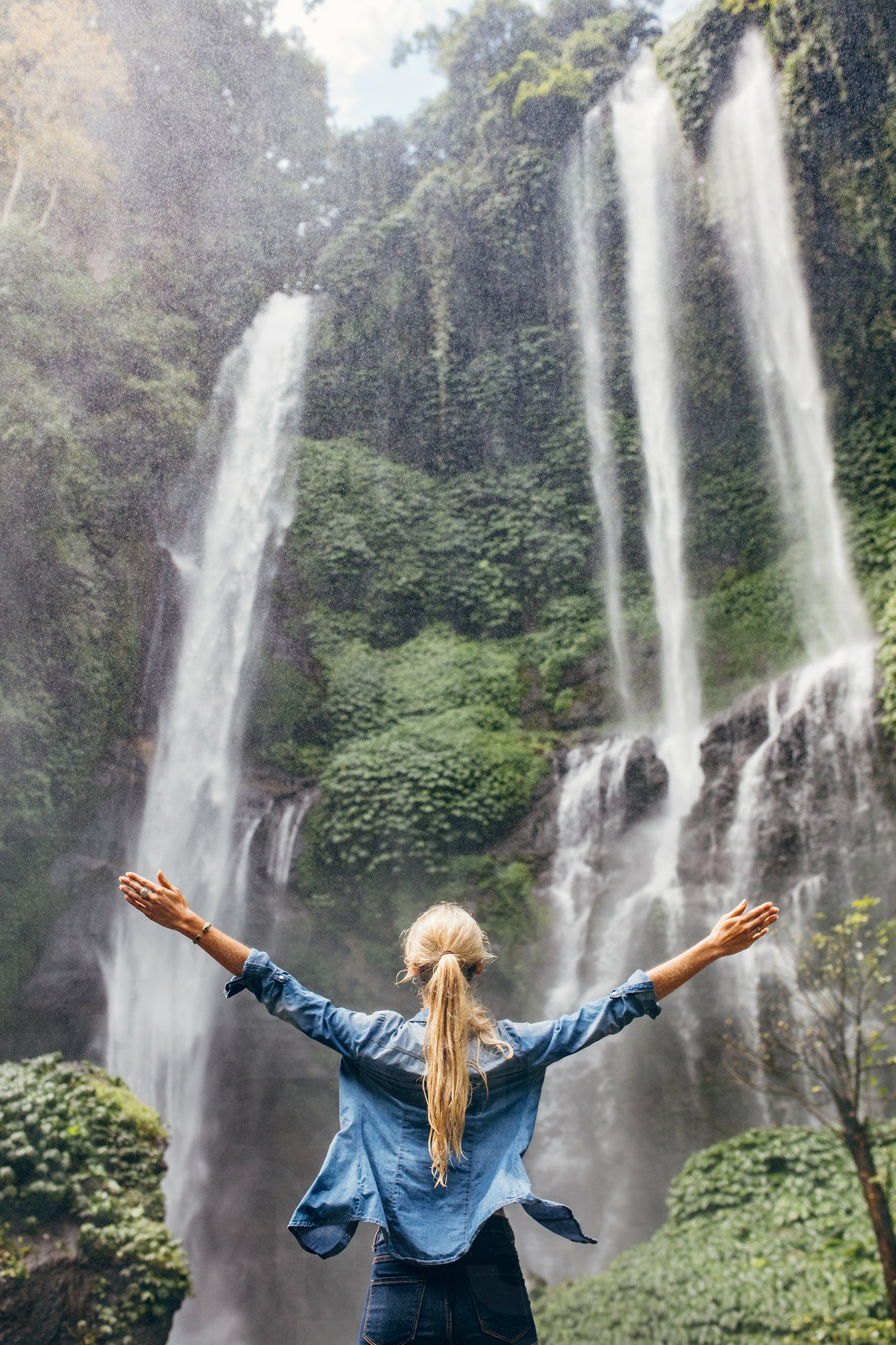 Rear view of woman standing in front of water fall with her hands raised. Female tourist with her arms outstretched looking at waterfall.