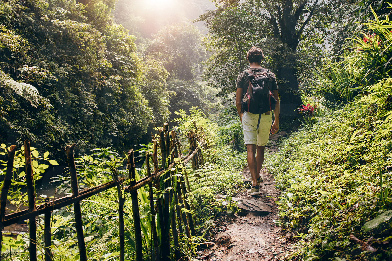 Rear view of young man hiking into the mountains. Tourist with a backpack walking along the trail in the forest.