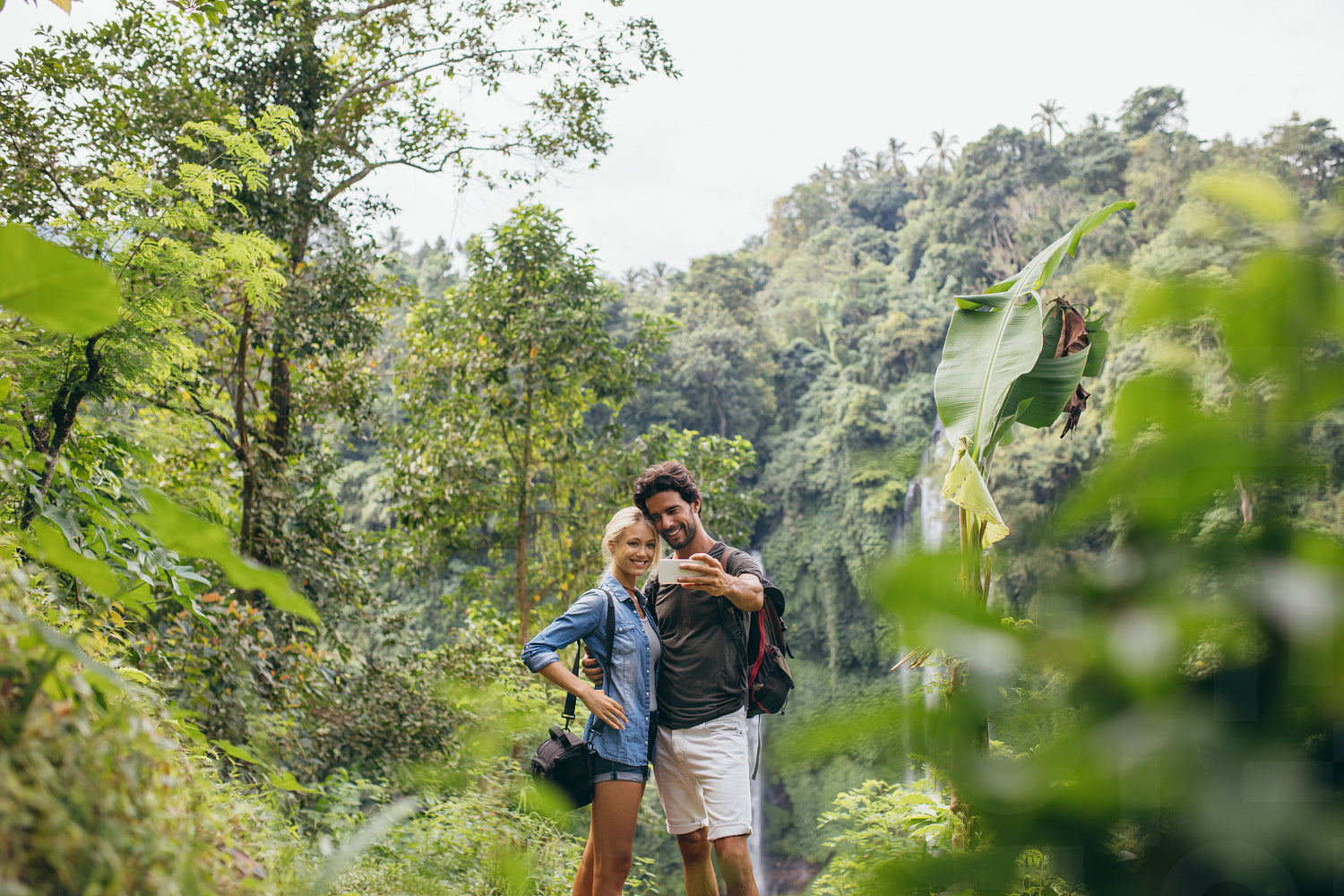 Young tourists taking selfie in the forest. Man and woman in forest taking self portrait with their cellphone.