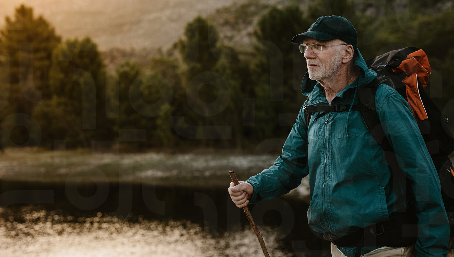Senior man walking by a river on mountain trail. Fit mature man carrying a backpack hiking in nature.