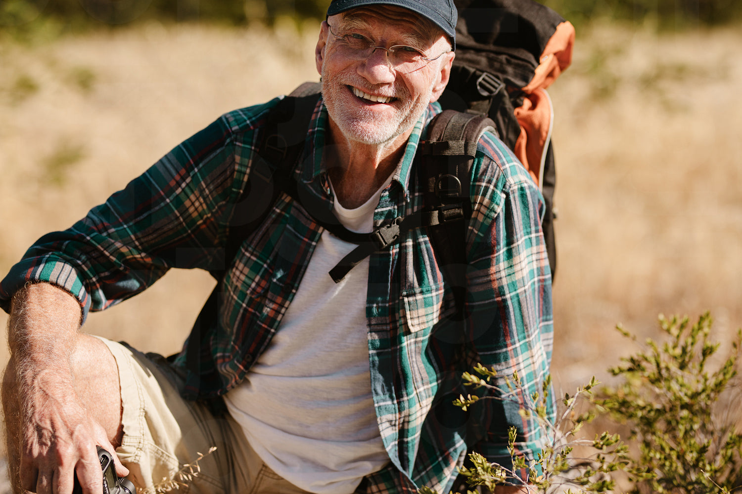 Portrait of a senior man carrying a backpack looking at camera and smiling. Retired male hiker taking a break, sitting on ground.