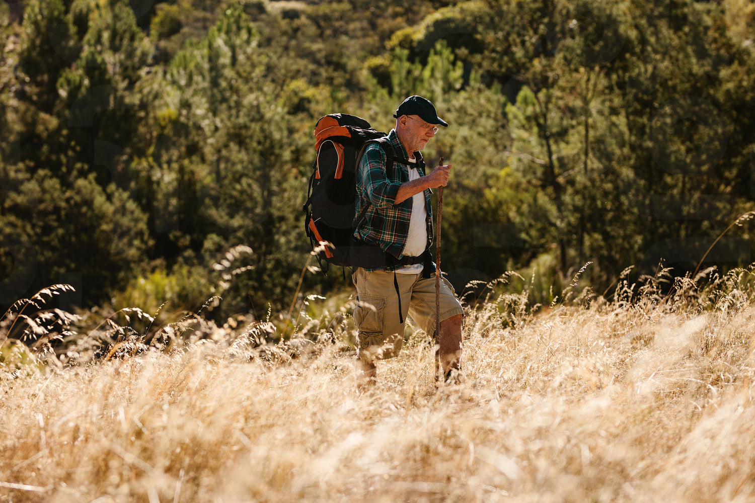 Senior man walking on mountain trail. Mature man carrying a backpack hiking in nature.