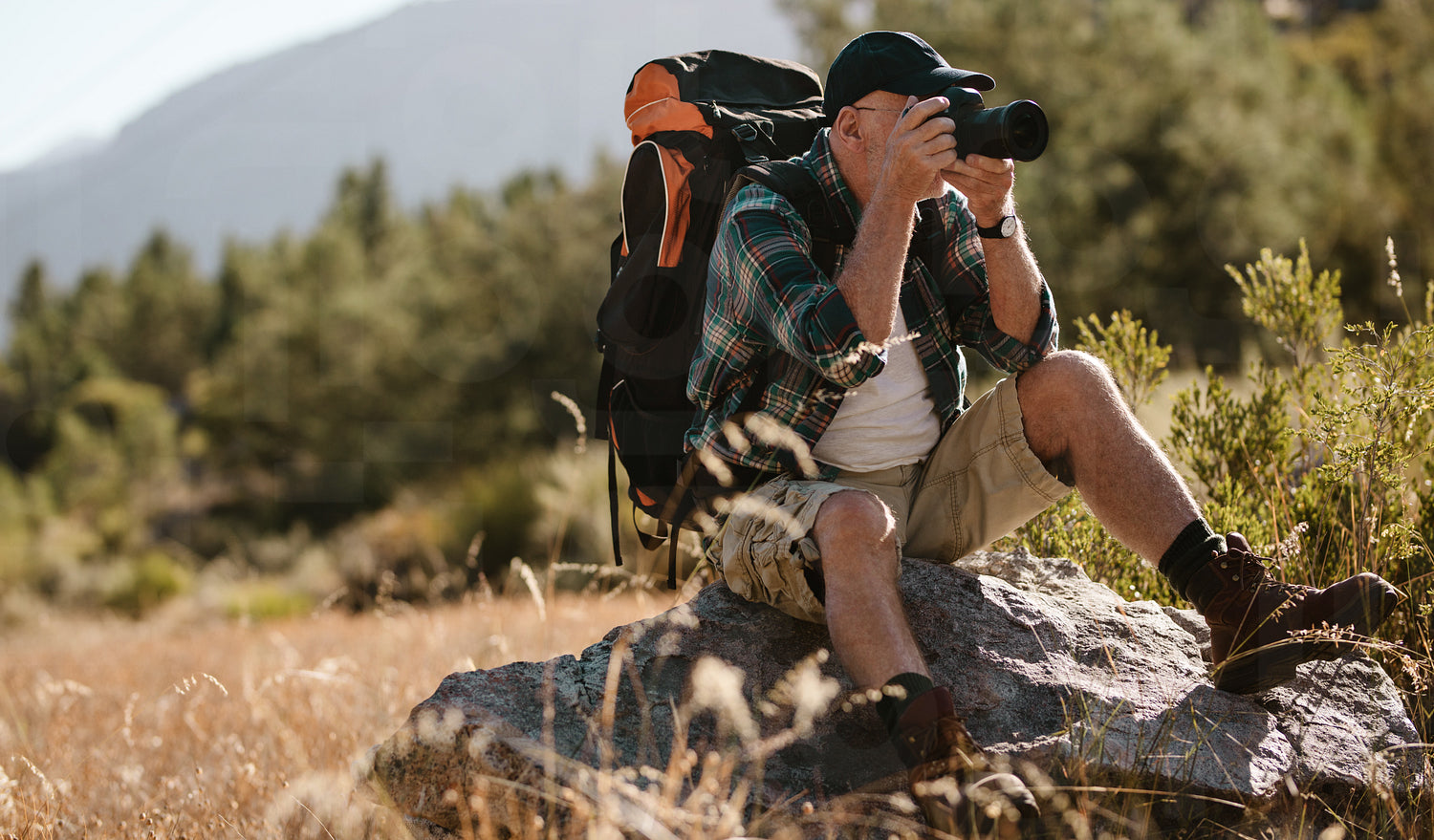 Senior man photographing with a digital camera. Retired man sitting on a rock and taking pictures on hiking trip.