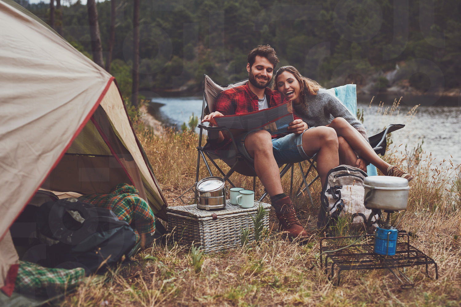 Loving young couple reading a travel map while sitting together outside their tent. Happy young couple camping next to the lake.