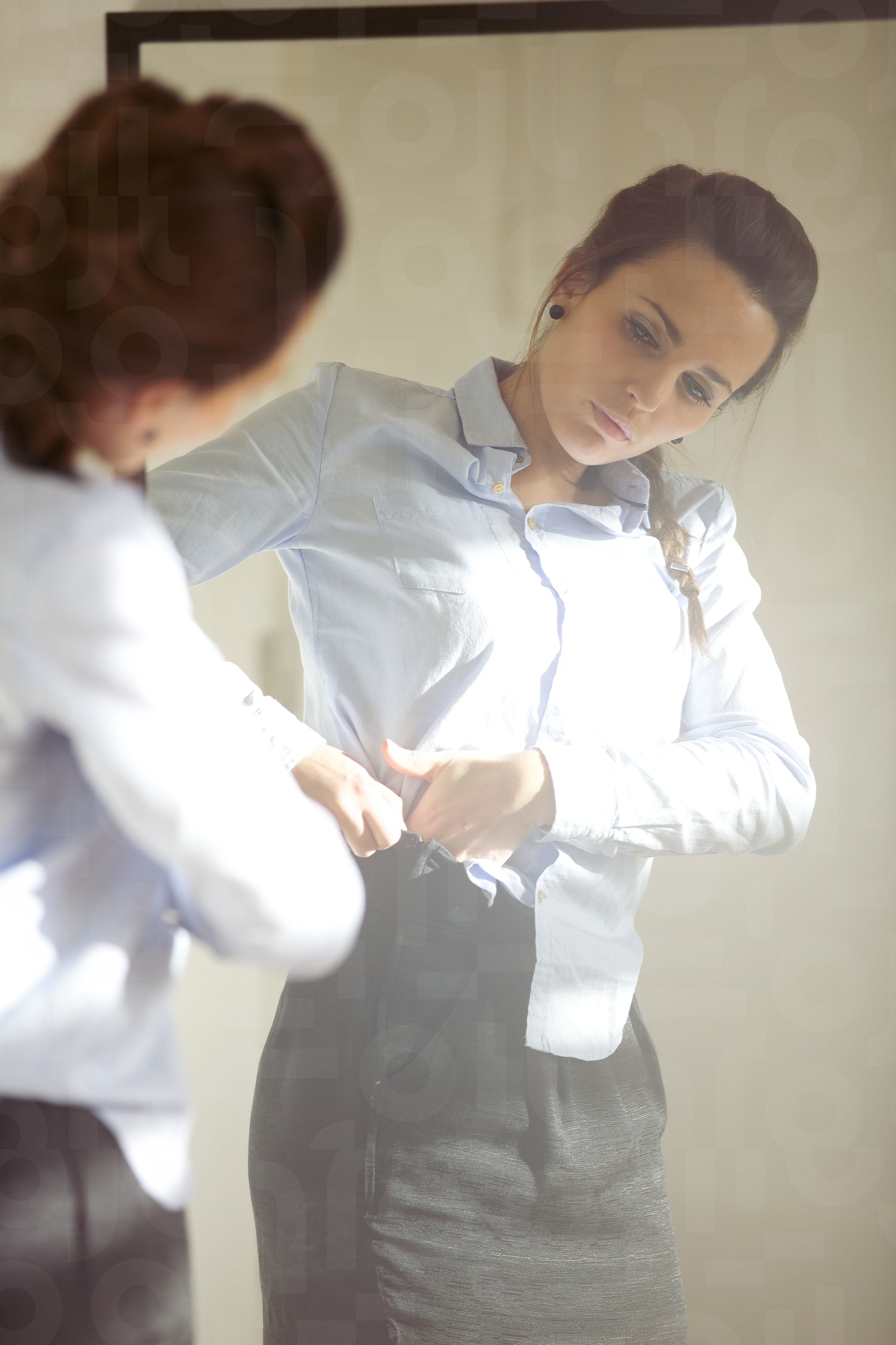 Beautiful young businesswoman wearing business attire in front of mirror. Young caucasian female model getting dressed at home.
