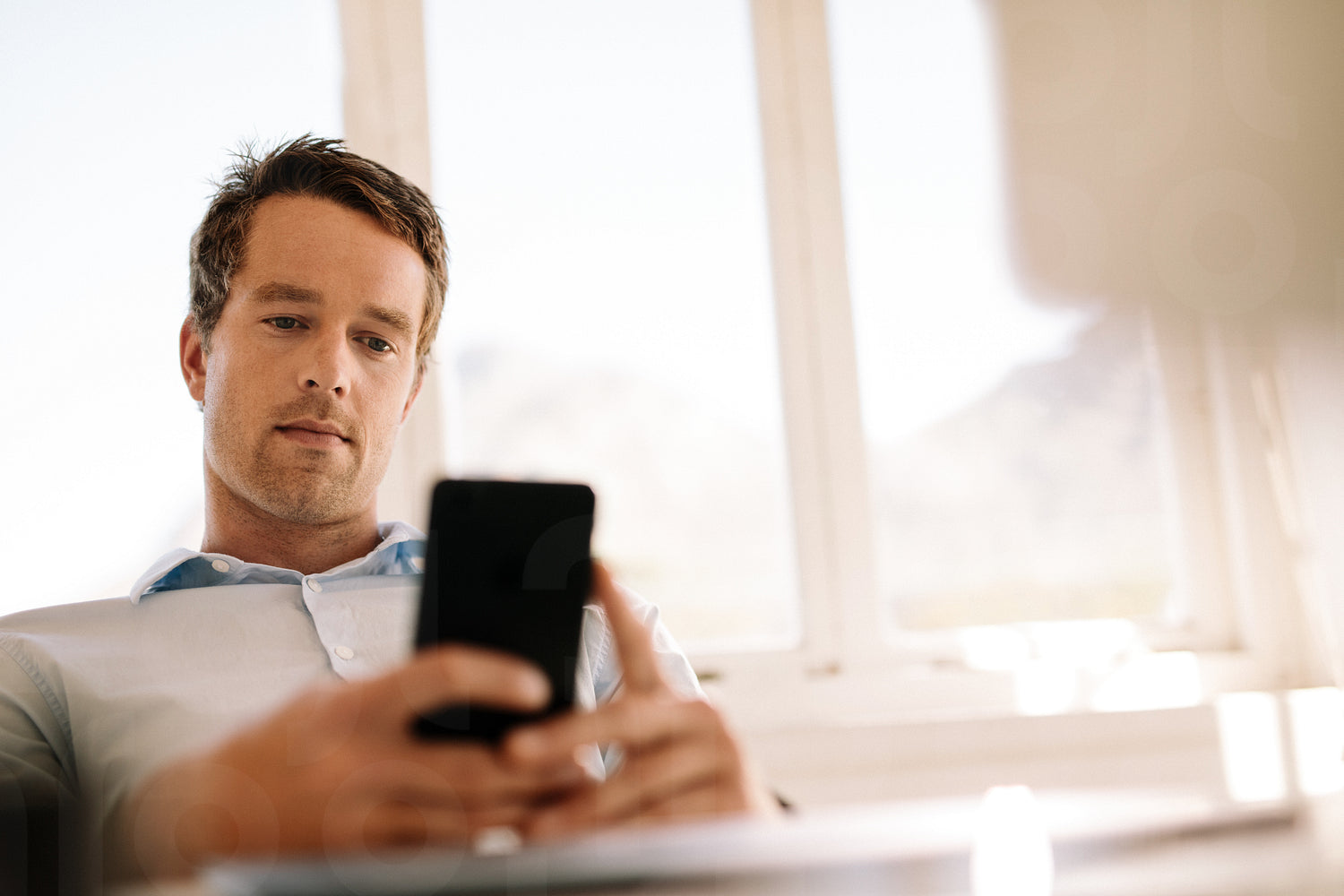 Entrepreneur working on mobile phone sitting in the comfort of home. Man operating mobile phone while relaxing at home.