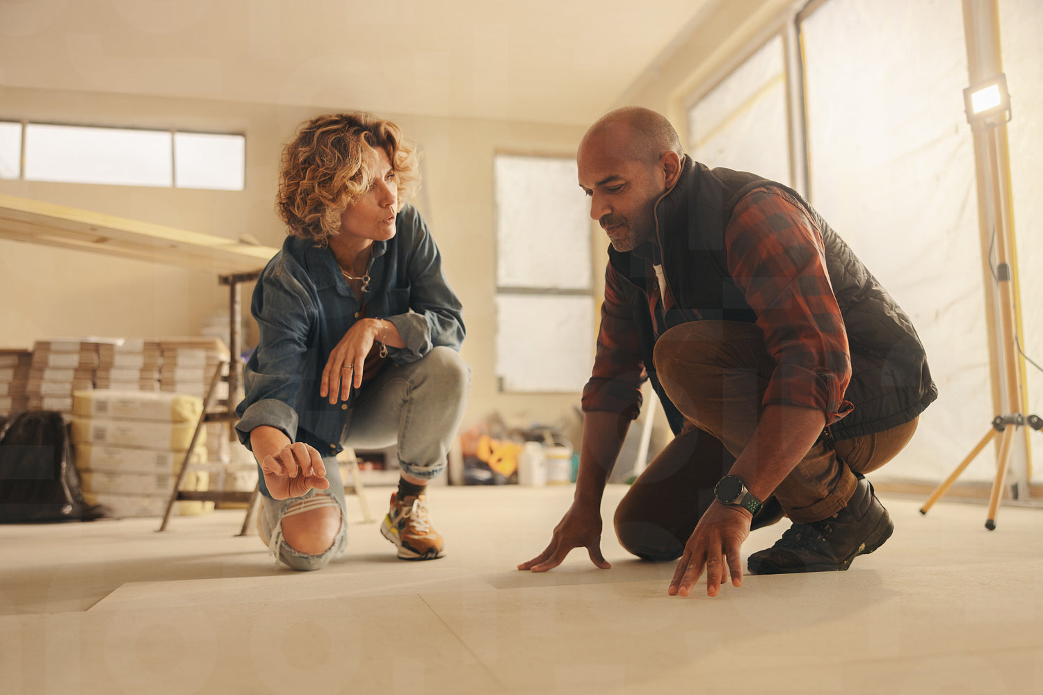 Man and woman discussing home renovation in their kitchen, collaborating as a team. They plan a remodel, focusing on flooring options and upgrades. Their teamwork and attention to detail are evident as they consider tile choices for the indoor project.