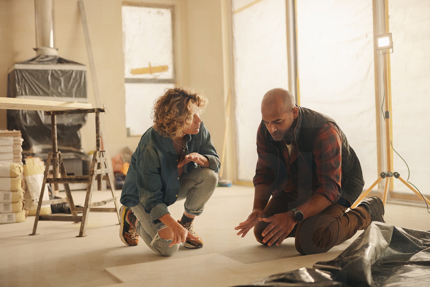 Collaborative home remodeling: A couple discussing interior redesign and flooring upgrade