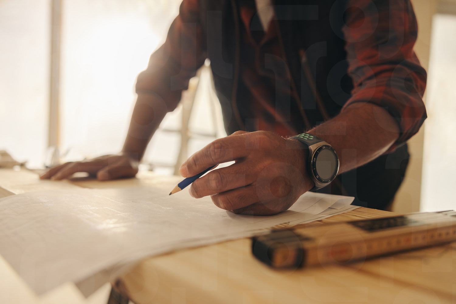 Contract worker marks blueprints with a pencil, demonstrating skill and professionalism. The indoor setting suggests a home improvement project, possibly involving construction or renovation.