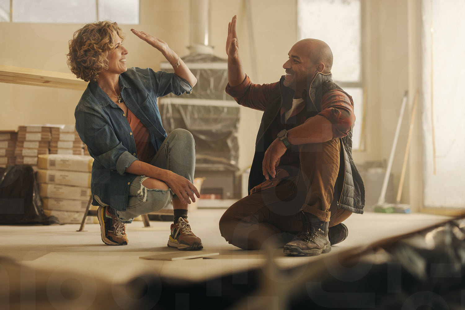 Mature couple celebrates successful home renovation with a high five in the kitchen. They worked together on upgrading the flooring with tiles. Their teamwork and DIY efforts shine through in this inspiring image of accomplishment.