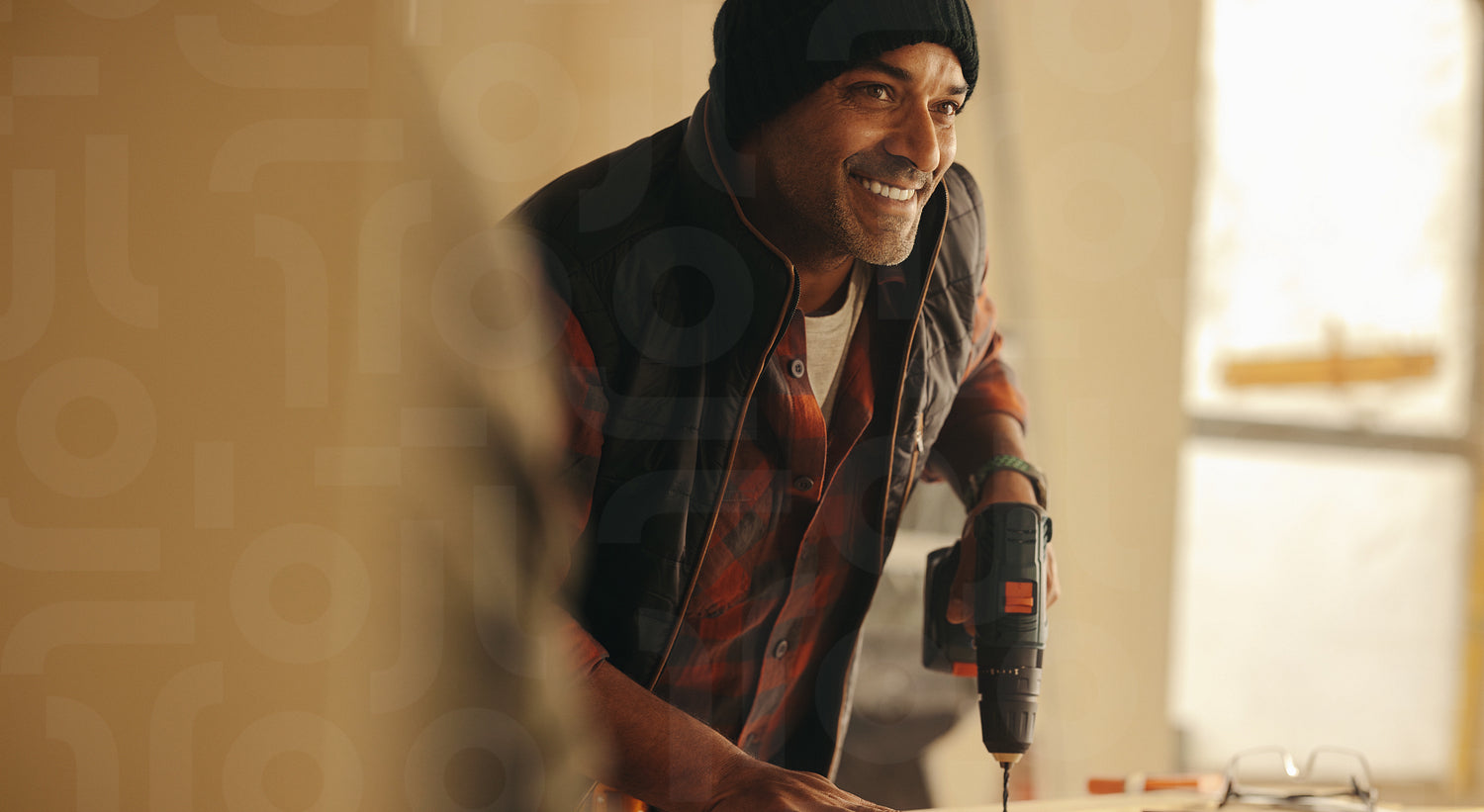 Construction worker handles a home renovation project. With a drill gun in hand, the skilled builder remodels the kitchen, upgrading the interior of the house. Renovator displays expertise and a bright smile throughout the work.