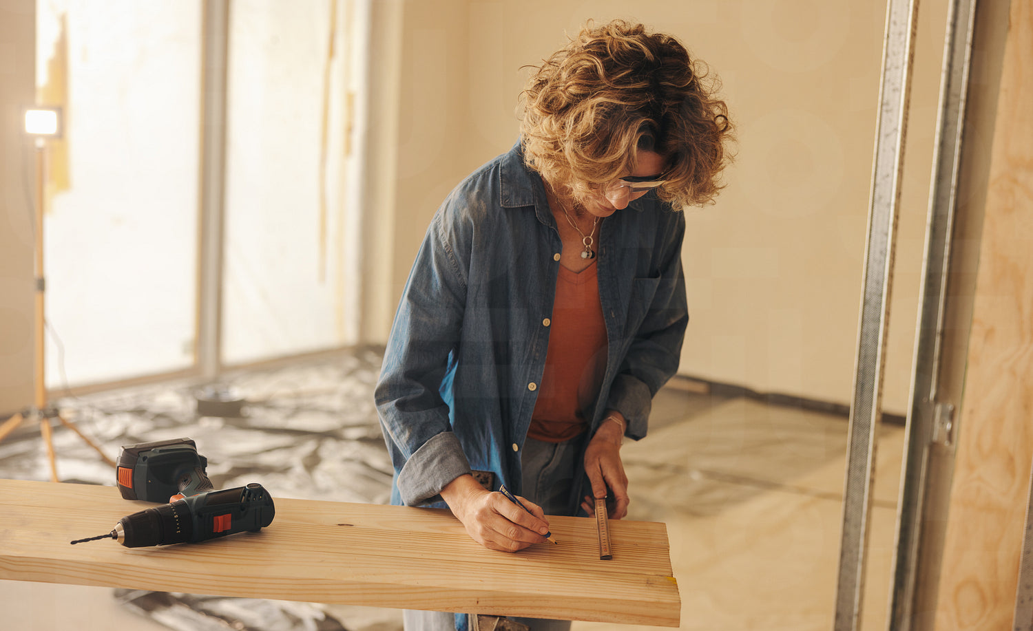 DIY homeowner, a mature woman, measures baseboard in her kitchen for a remodeling project. Using a tape measure, she marks and prepares for the renovation, displaying carpentry skills and dedication to home improvement.