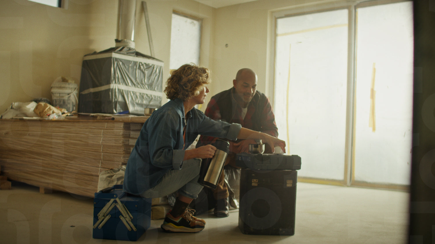 Mature woman pours hot beverage from thermos for bald man in a room under renovation. They're both sitting and taking a break.