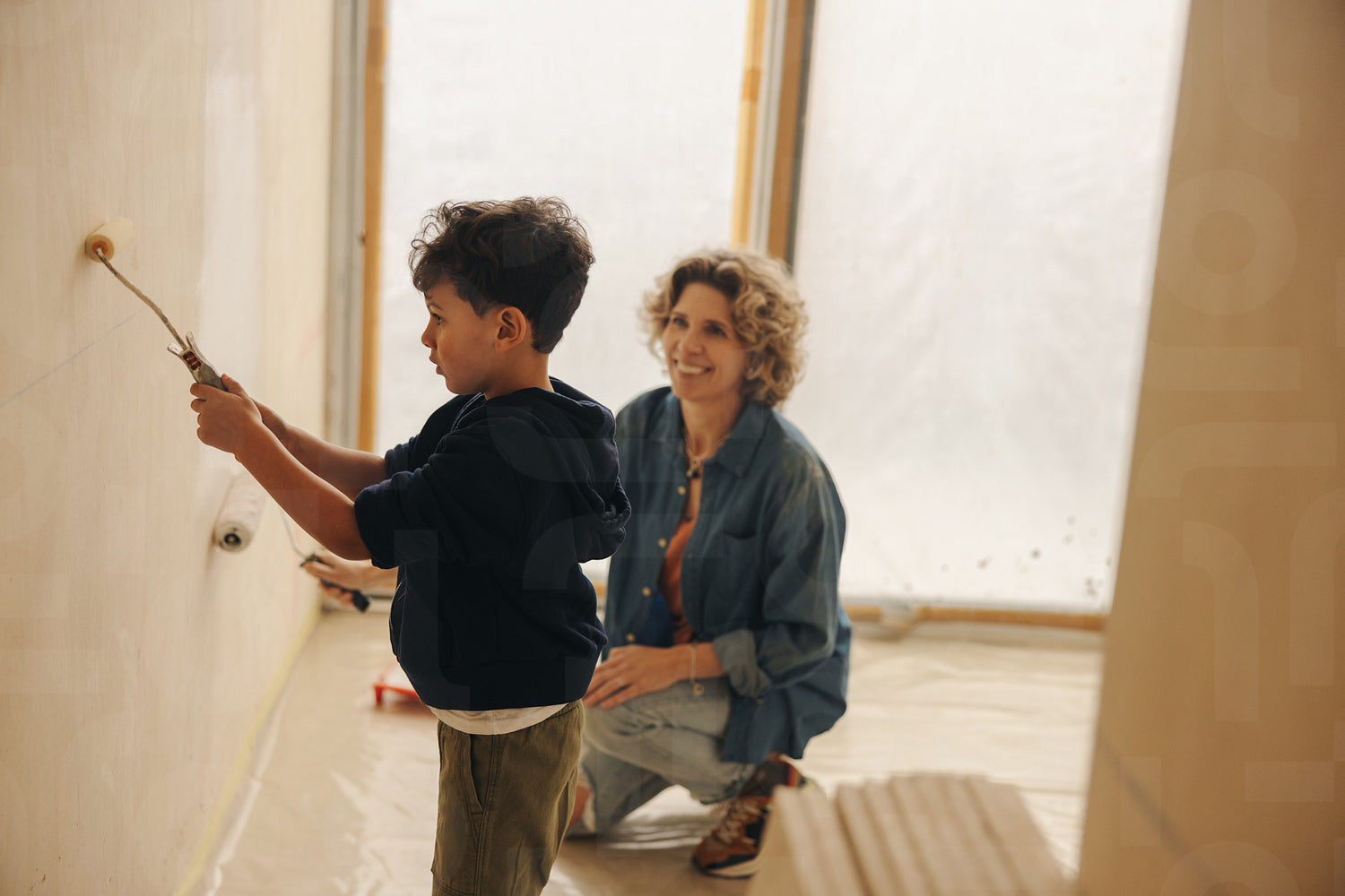 Happy mother and son bond over a DIY painting project at home. Together, they renovate and improve the interior of their house, showcasing their creativity and smile throughout the process.