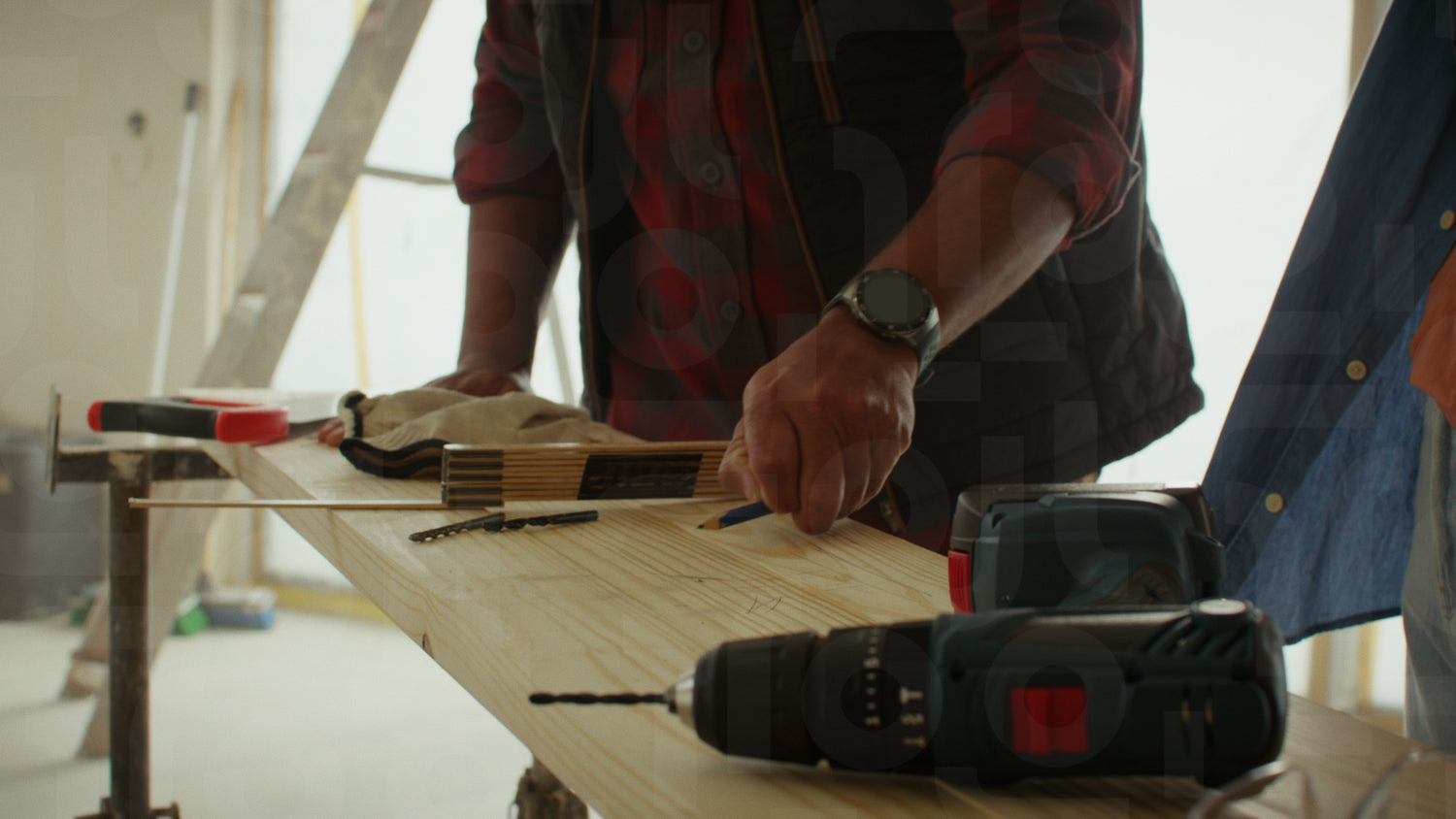 A middle-aged man and woman discuss home renovation plans, using a measuring tape and pencil on a wooden plank. Medium close-up, landscape orientation.