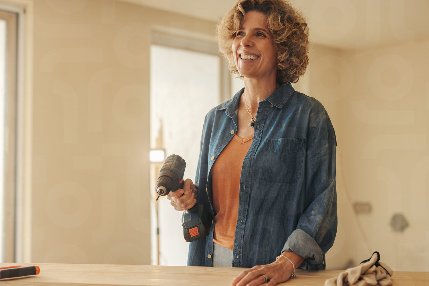 Woman smiling and holding a drill tool during a home kitchen remodeling project