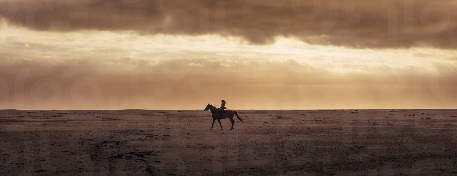 Silhouette of a woman riding horse along the beach. Evening view of woman horse riding on the sea shore. Wide angle shot.