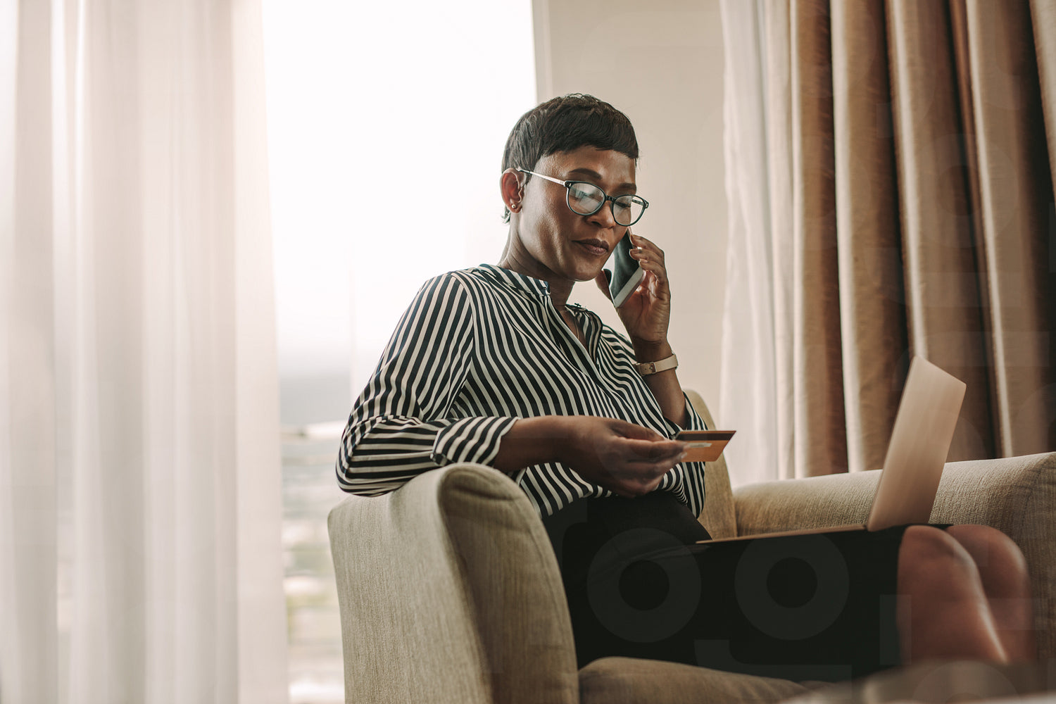 Woman sitting in armchair with laptop and credit card talking over mobile phone. African businesswoman doing online payments from hotel room.