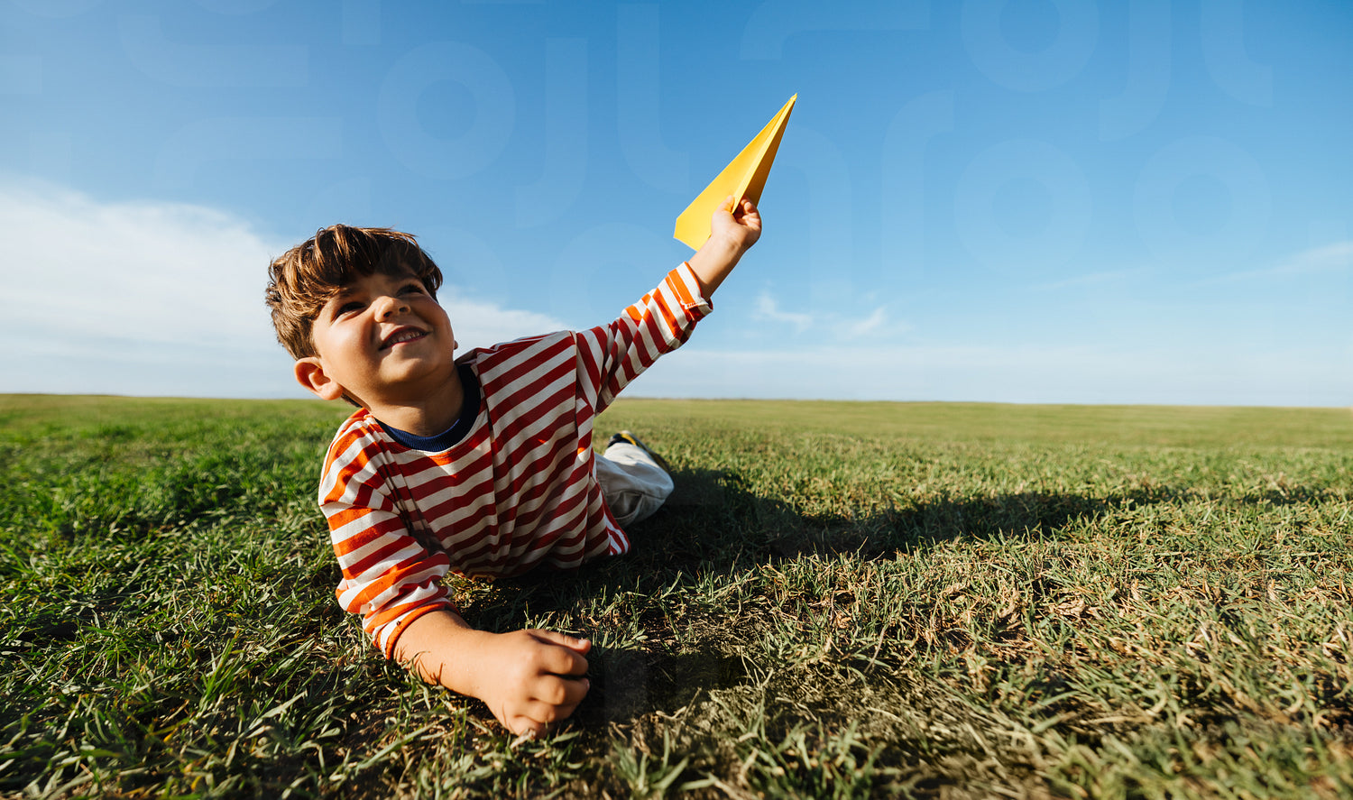 A young boy lies in a grassy field while launching a paper airplane into the sky, expressing childhood imagination, playful creativity, freedom, and dreaming big through simple outdoor play.